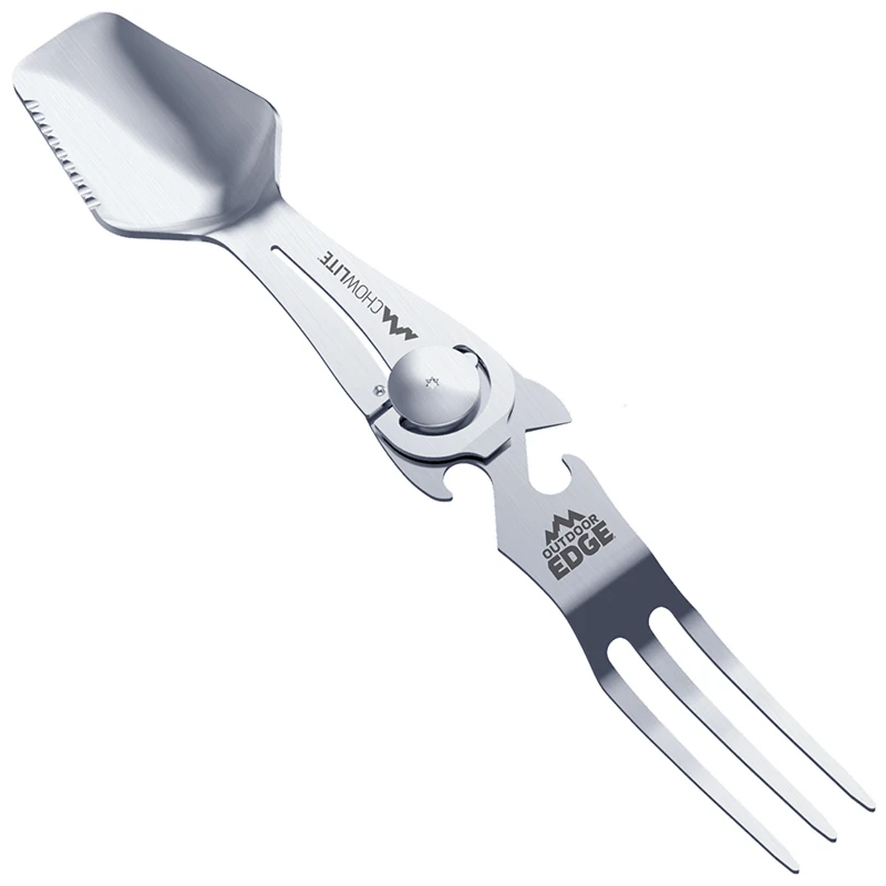 This lightweight stainless steel eating utensil gets the job done while taking up minimal space. The folding design swings open and locks securely, revealing a full size fork and spoon with a serrated food separator, integrated bottle opener, can opener and flathead screwdriver.