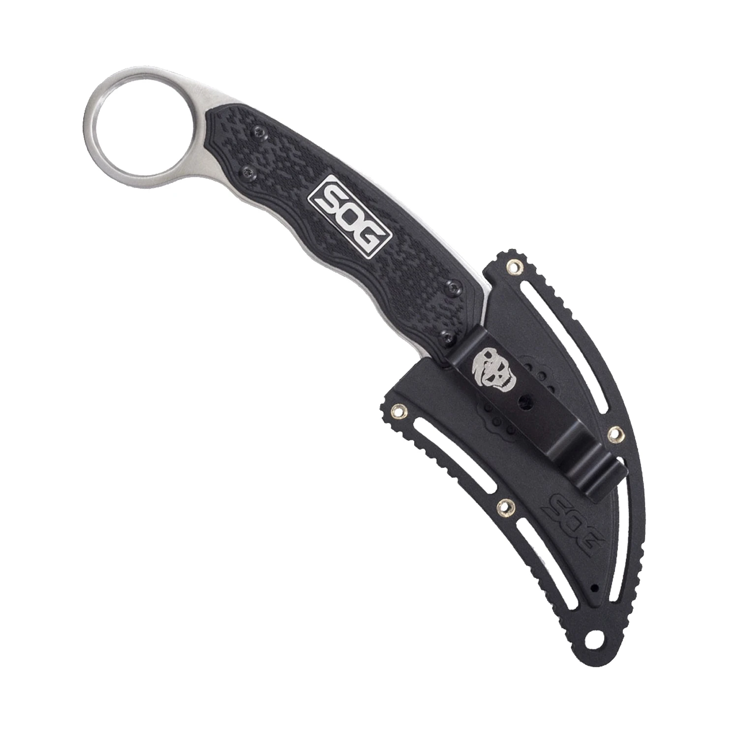 A fixed blade designed to handle multiple uses including personal protection, utility tasks, and more, the SOG Gambit is built to perform at all times. Comfortable in both forward and reverse grip, the unique, ergonomic handle is held up by the knife’s full tang design for added strength. Resembling a claw, the hooked 2.6-inch blade offers added functionality for hooking, tearing, and ripping. The Gambit comes with a hard nylon sheath for easy carry. Historically, this style of blade has been for self-defense and agriculture use. While it is still used for these purposes, it is also great for the outdoors. Item GB1001-CP